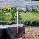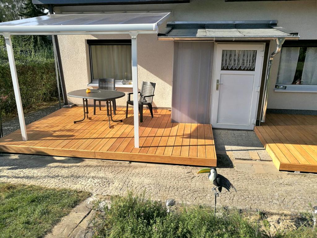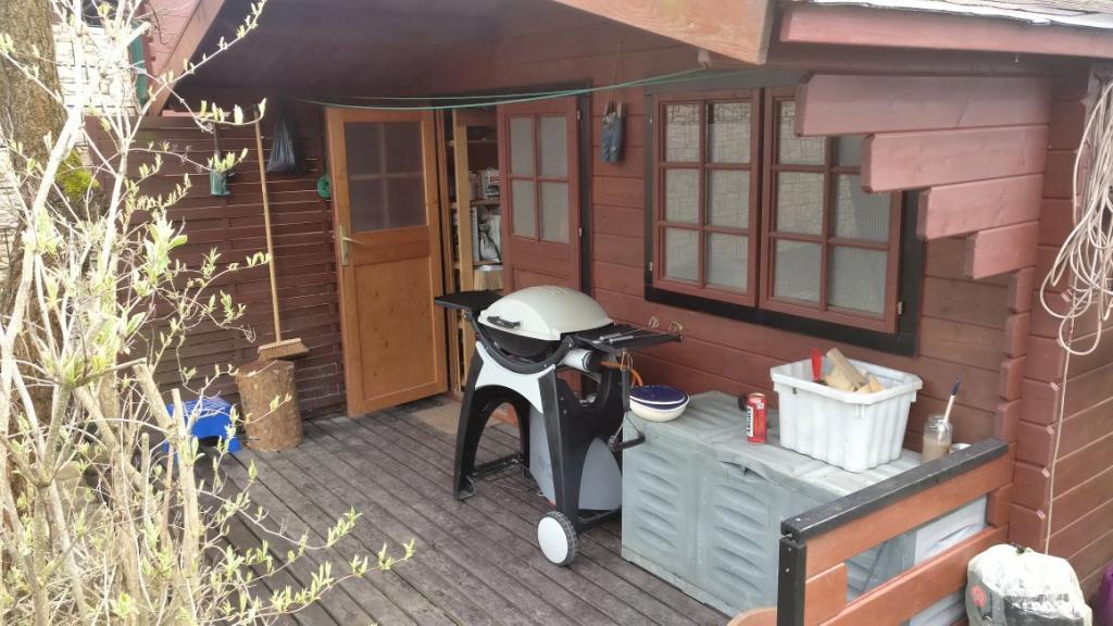 Vor dem Eingangsbereich des Wochenendhauses befinden sich zwei Lärchenholzterrassen. Eine der Terrassen ist überdacht und mit einer Seitenmarkise als Sicht- und Regenschutz versehen. Von der Terrasse aus hat man einen schönen Blick auf das Grundstück. Das mit einem Zaun eingefasste Grundstück ist vermessen. Die Rasenfläche ist umgeben von Flieder, weiteren Ziergehölze und Stauden. Auch ein paar Nadelgehölze wachsen bereits auf dem Grundstück. Das Grundstück gestaltet man sich nach eigenen Vorstellungen, Platz für Lieblingskräuter, Gemüseexperimente und einen Grillbereich etc. ist vorhanden.
