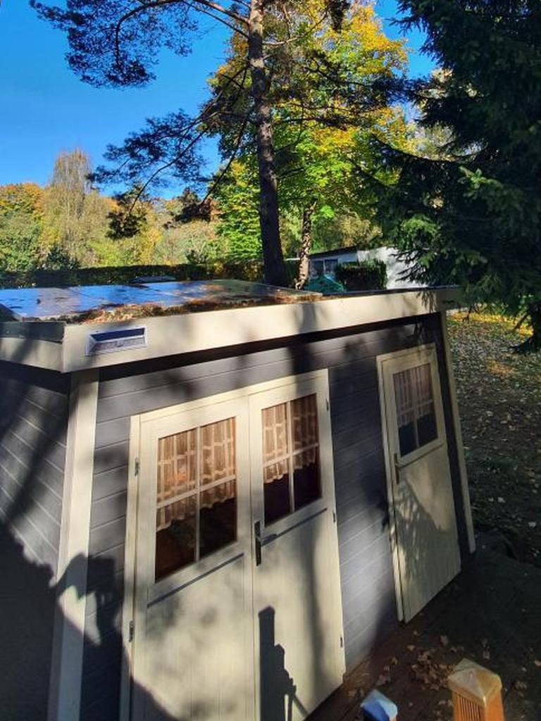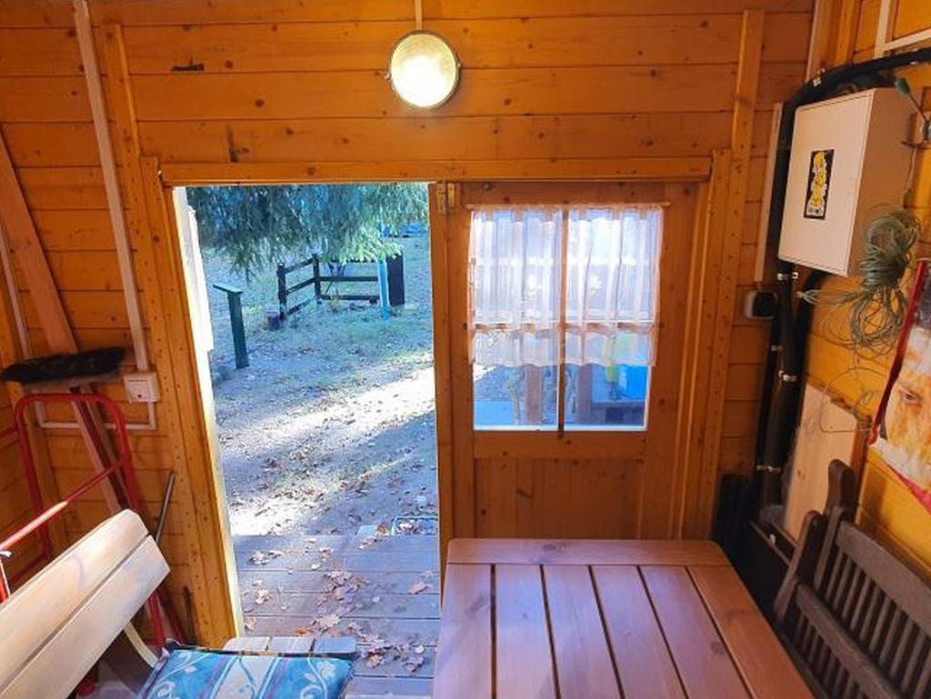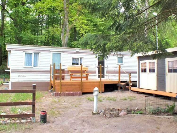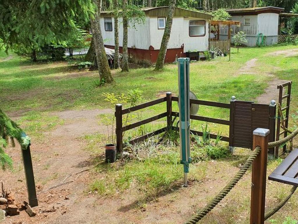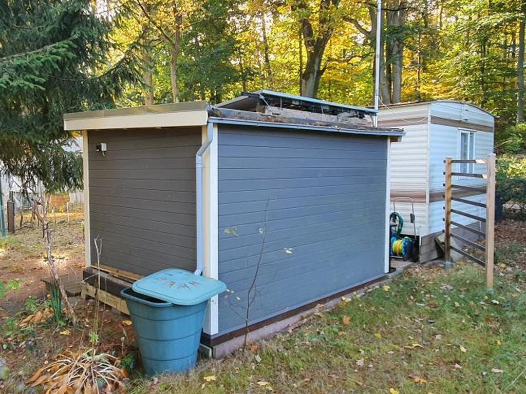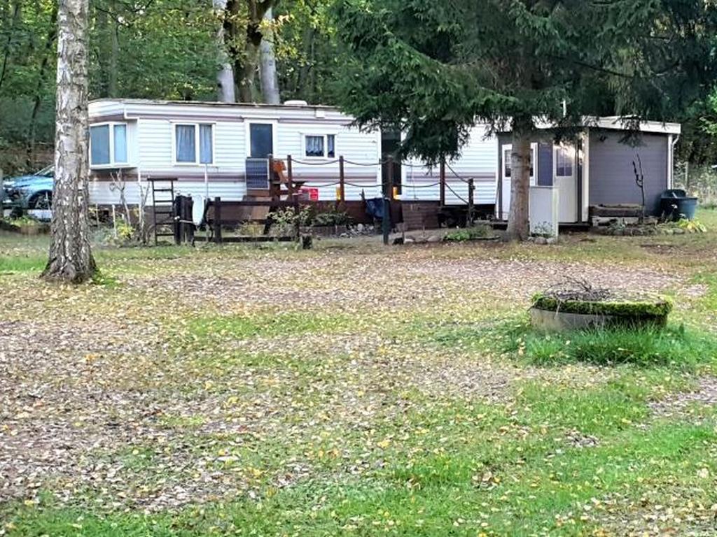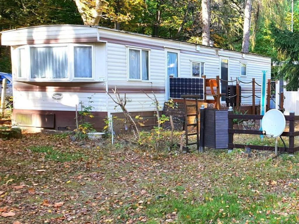 Das ca. 40 m² große Mobilheim steht auf einem Pachtgrundstück am Waldrand und gehört zum ca. ein km entfernten Campingplatz. Es bietet einen Wohnraum mit offenem Küchenbereich, zwei Schlafzimmer, ein Bad mit Dusche, WC und Waschbecken sowie ein separates Gäste-WC und einen kleinen Flur. Die Aufteilung eignet sich ideal für Familien – im Wohnbereich entstehen durch das Ecksofa zwei weitere Schlafplätze, so dass auch Übernachtungsgäste willkommen sind. Für Wärme sorgt eine mit Propangas betriebene Kaminheizung. Auf der Terrasse lässt sich wunderbar im Freien frühstücken oder der Abend entspannt ausklingen. Im angrenzenden Gartenhaus befinden sich eine kleine Werkstatt sowie ein Lagerraum für Gartenmöbel und Geräte. Ein Teil des Inventars verbleibt im Mobilheim, weitere Gegenstände können nach Absprache übernommen werden.