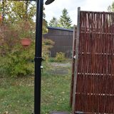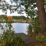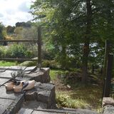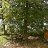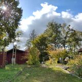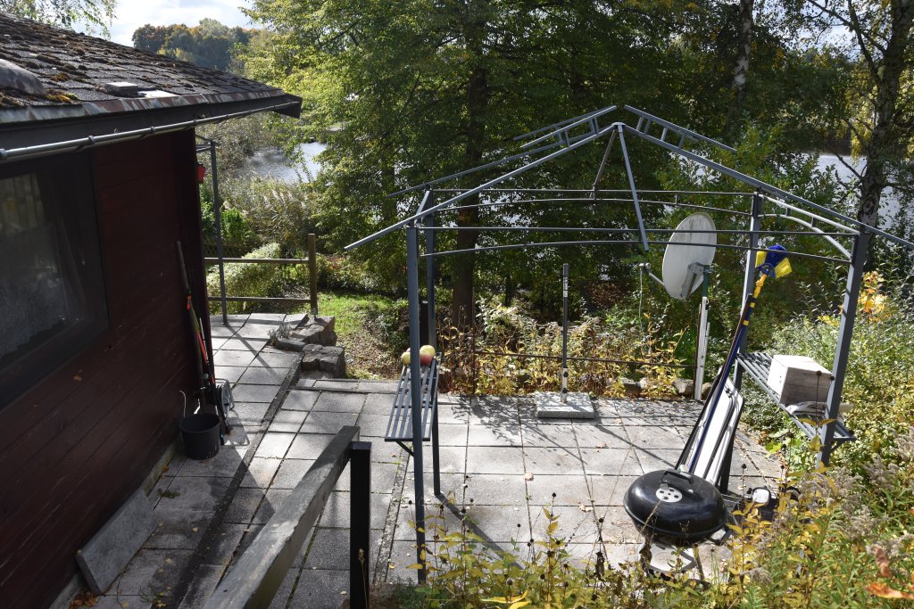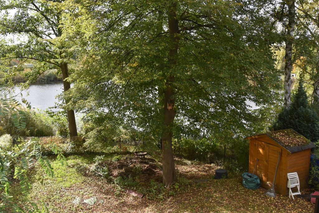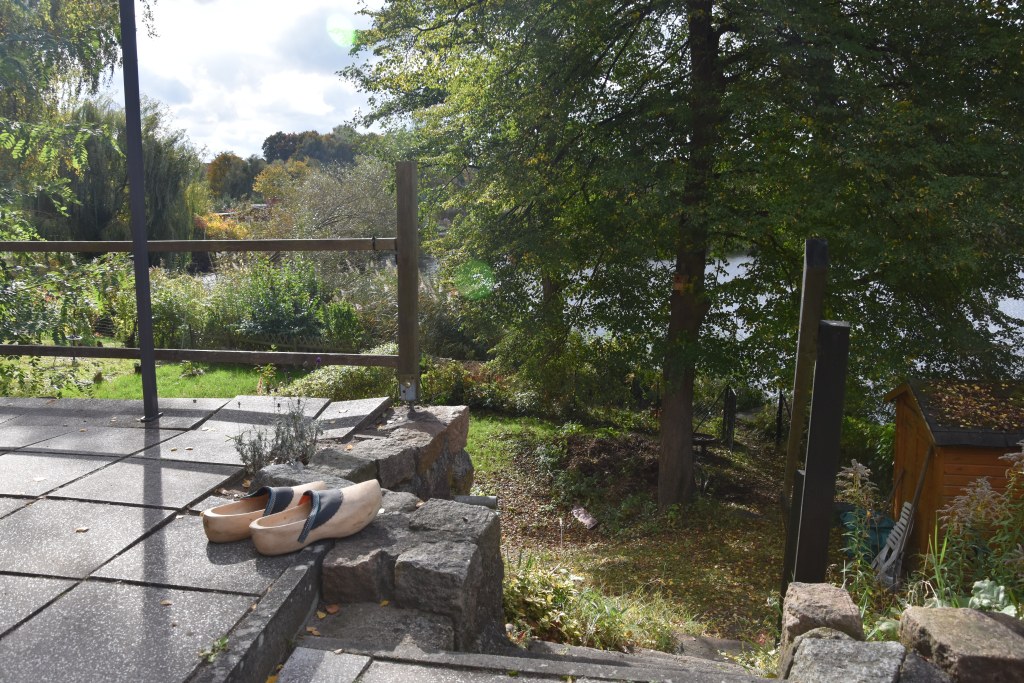Der große Garten ist in Richtung „Wasserkante“ terrassiert angelegt: Im oberen Bereich sind die von Obstgehölzen flankierten Beete angelegt. Gartenliebhaber finden hier viel Platz für Lieblingsgemüse, Kräuter und Blumen. Gartenhaus und Terrasse sind im hinteren Bereich platziert, so dass man einen ruhigen Rückzugsbereich hat. Von der sichtgeschützten Terrasse aus hat man den Blick aufs Wasser. Ein festes Metallgerüst dient der Terrassenüberdachung, die sich mit wenigen Handgriffen spannen lässt. Weiteren Platz für Besuch von Freunden und als Grillplatz bietet die zweite Terrasse neben dem Gartenhaus - ebenfalls mit Blick zum Wasser. Zum kleinen, klaren Gewässer führen ein paar Stufen auf der Natursteintreppe hinab zum naturbelassenen, unteren Uferbereich und dem eigenen stabilen Steg mit Badeleiter.