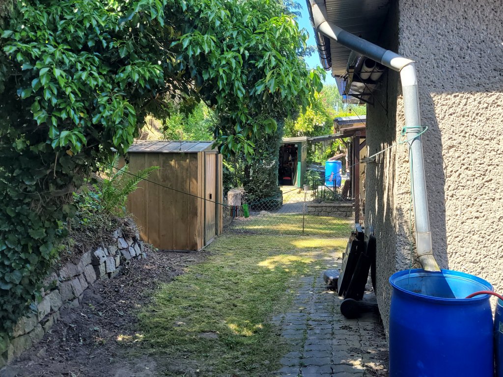 Das Grundstück besteht aus einem kleinen, waldigen Hangteil am Fuße des Trebelbergs und einem ebenen, größeren Grundstücksteil, den man von der großzügigen Terrasse aus sehr gut überblicken kann.