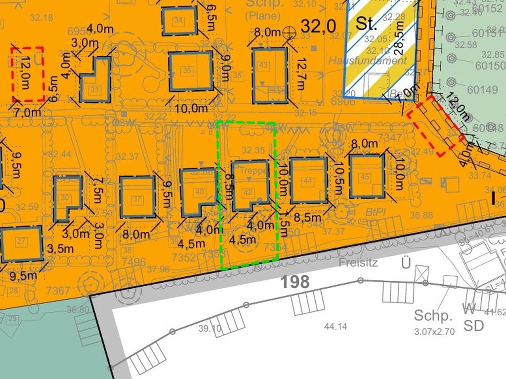 Durch den rechtskräftigen Bebauungsplan für Wochenendhäuser besteht größtmögliche baurechtliche Sicherheit: Sogar ein kompletter Neubau ist innerhalb des Baufeldes möglich. Ein neues Wochenendhaus darf eingeschossig sein, mit einer Firsthöhe bis 4 m und einer Grundfläche bis 50 m². Zudem sind eine Terrasse bis 10 m² und ein Stellplatz bis 15 m² möglich. Für den Neubau ist eine Baugenehmigung erforderlich.
