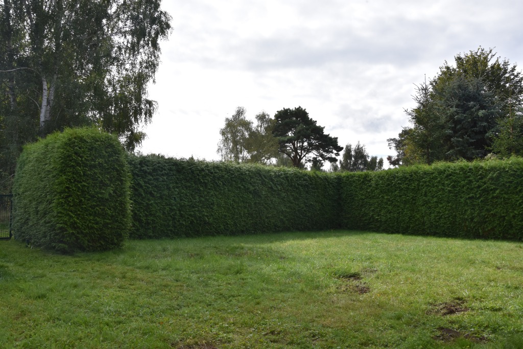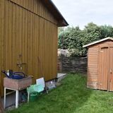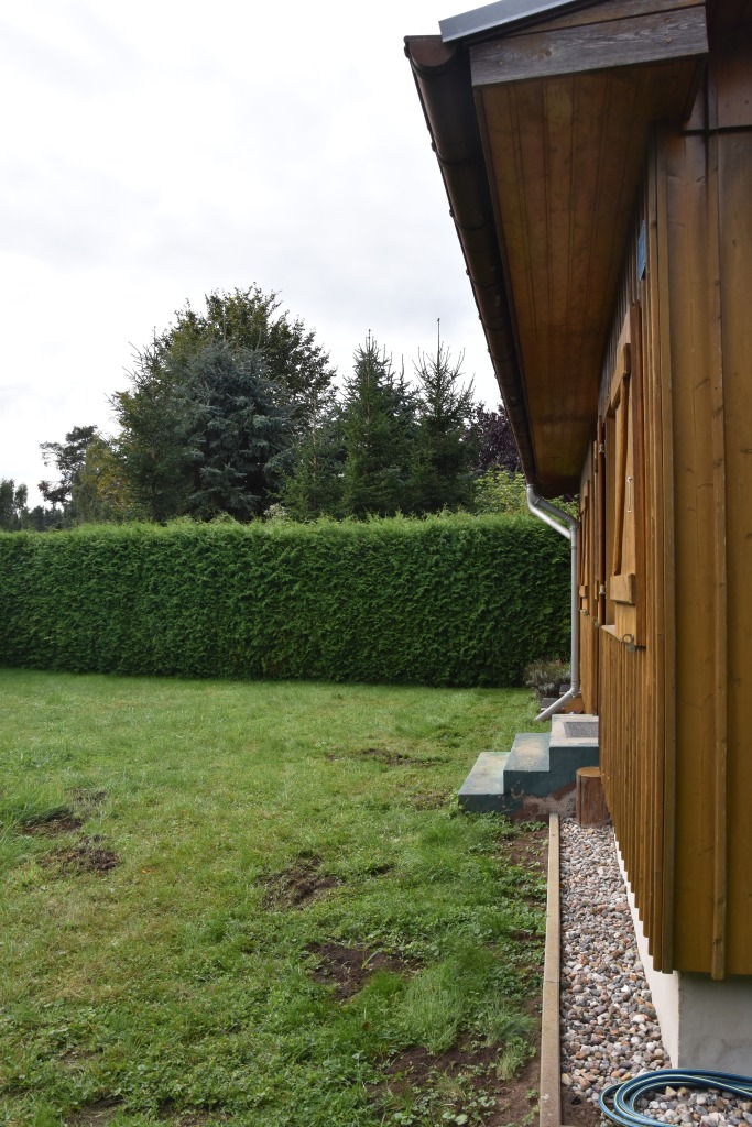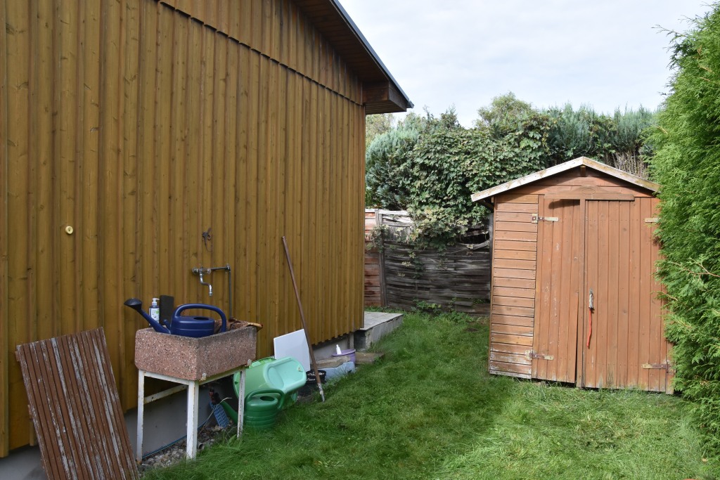 Von der Küche aus betritt man die seitlich platzierte, überdachte und stabil gebaute Holzterrasse, die ausreichend Platz bietet für den Frühstückskaffee im Freien, Workation im Garten oder die Familienfeier. Auch eine Hängematte lässt sich hier spannen! Das Grundstück ist von blickdichten Hecken eingefasst, die für Privatsphäre und ungestörte Mußestunden mit einem guten Buch sorgen, so dass man schön für sich sein kann. Von der erhöht liegenden Terrasse blickt man auf den vorderen Grundstücksbereich, der mit Rasen gestaltet ist und viel Platz bietet für Kinder zum Toben, Kicken, ein Trampolin oder einen Aufstellpool. Im Holzschuppen werden die Gartengeräte untergebracht. Der Verkauf erfolgt mit dem Großteil an Inventar. Das Auto wird auf dem Grundstück geparkt.