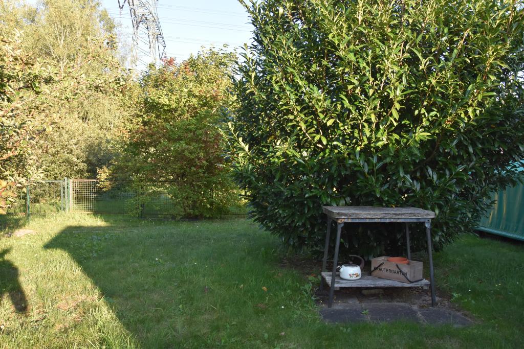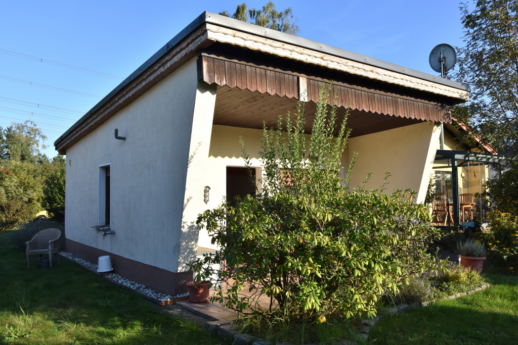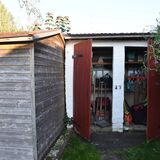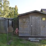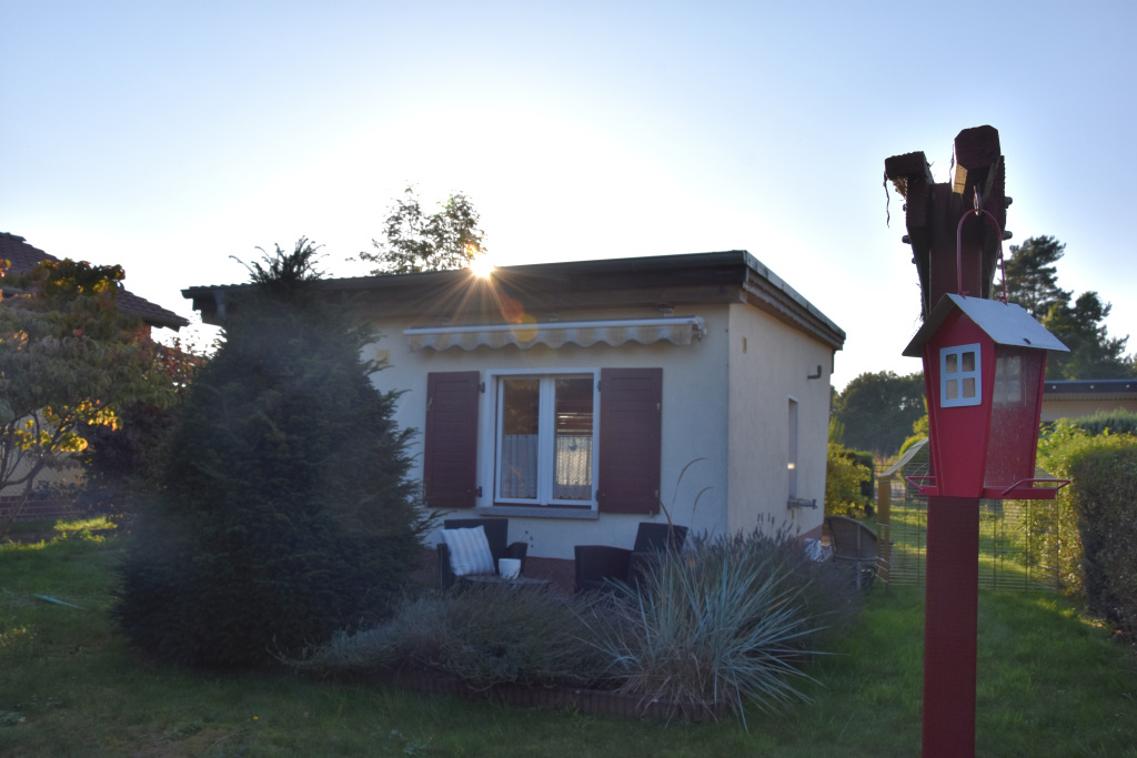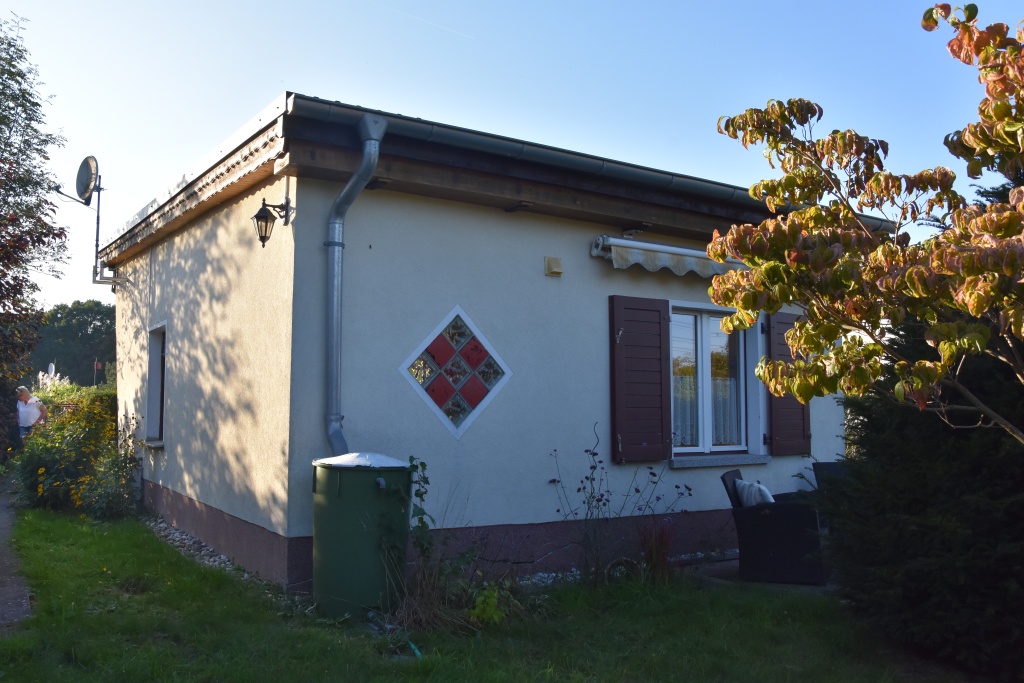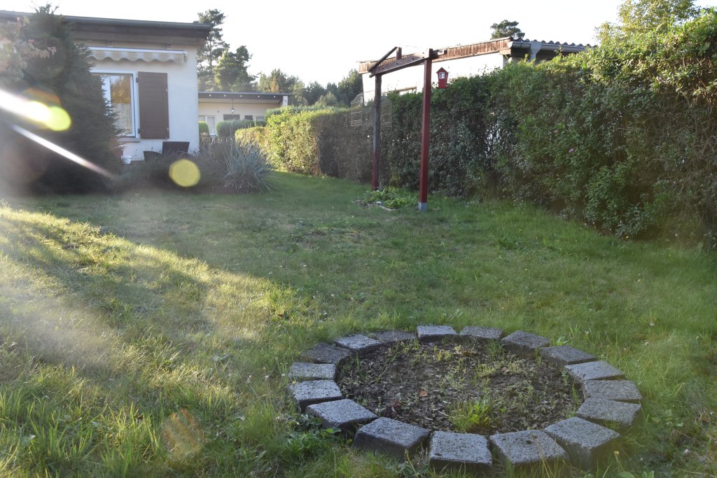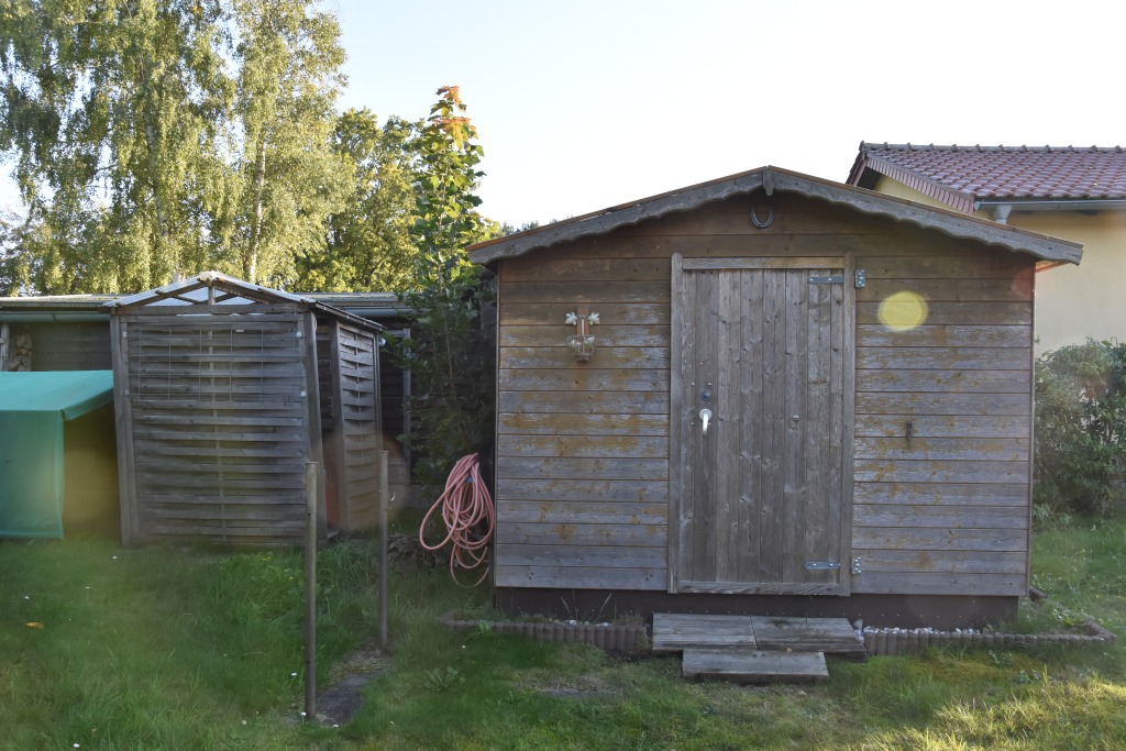 Zum Weg vorn und zur Rückseite ist das Grundstück mit einem Zaun eingefasst. Die Nachbarschaft ist durchmischt, das Grundstück ist zu den anliegenden Nachbarn durch Hecken abgegrenzt. Je nach Sonnenstand kann man für Mußestunden auf einer der beiden größtenteils sichtgeschützten Terrassen verweilen: Die auf der Rückseite gelegene Terrasse ist mit einer Markise überdachbar, hat Morgensonne und den Blick auf den hinteren Grundstücksteil. Auf der vorderen Terrasse hat man die Abendsonne und den Blick auf die Staudenbeete.  Insbesondere der hintere Grundstücksteil mit Rasen bietet viel Raum für eigene Ideen: Beete für Kräuter oder Blumen, ein Trampolin, ein Räucherofen für den eigenen Fang ... hier ist vieles denkbar! Gartengeräte sind in mehreren Schuppen untergebracht, hier ist auch Platz für das eigene Faltboot und die Angler-Ausrüstung.  Trinkwasser und Abwasser sind angeschlossen. Strom liegt an, der eigene Stromkasten steht auf dem Grundstück.  Das Auto kann auf dem Grundstück geparkt werden.
