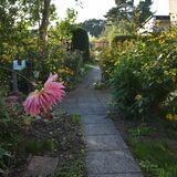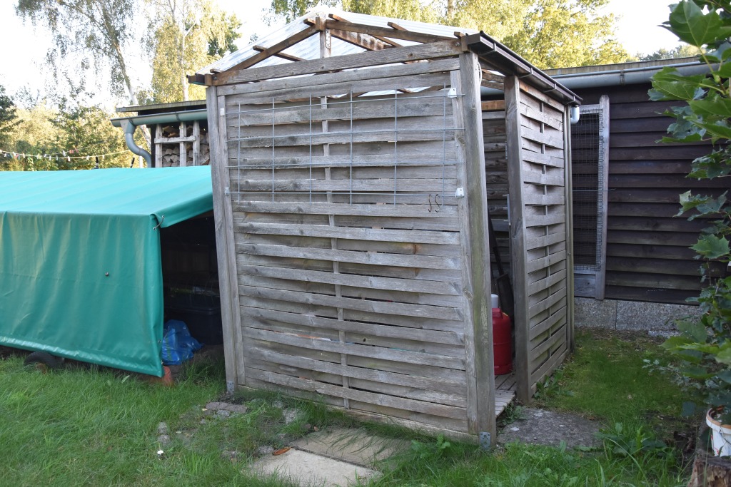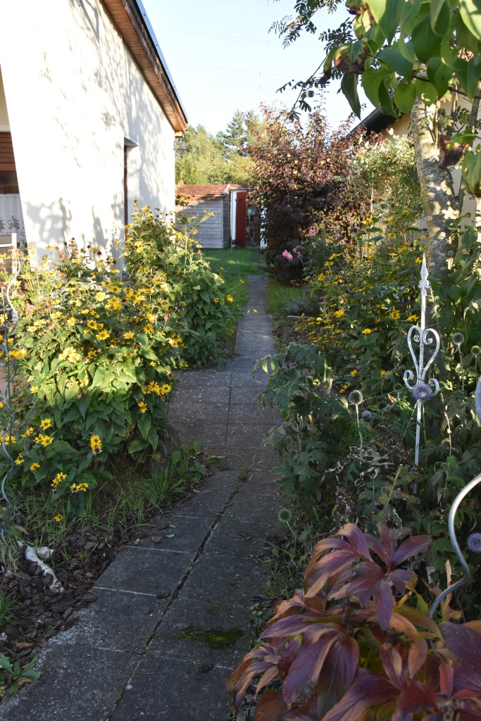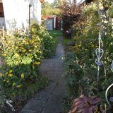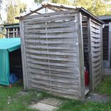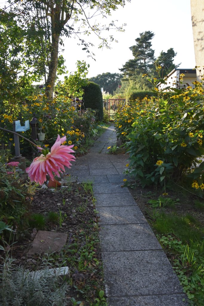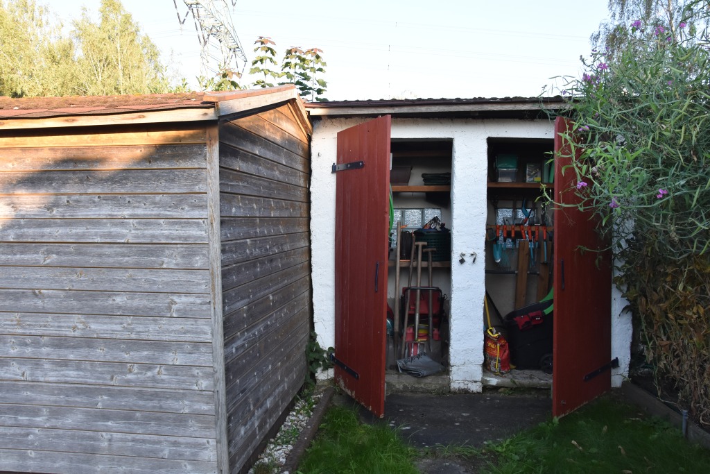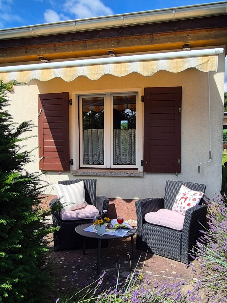 Zum Weg vorn und zur Rückseite ist das Grundstück mit einem Zaun eingefasst. Die Nachbarschaft ist durchmischt, das Grundstück ist zu den anliegenden Nachbarn durch Hecken abgegrenzt. Je nach Sonnenstand kann man für Mußestunden auf einer der beiden größtenteils sichtgeschützten Terrassen verweilen: Die auf der Rückseite gelegene Terrasse ist mit einer Markise überdachbar, hat Morgensonne und den Blick auf den hinteren Grundstücksteil. Auf der vorderen Terrasse hat man die Abendsonne und den Blick auf die Staudenbeete.  Insbesondere der hintere Grundstücksteil mit Rasen bietet viel Raum für eigene Ideen: Beete für Kräuter oder Blumen, ein Trampolin, ein Räucherofen für den eigenen Fang ... hier ist vieles denkbar! Gartengeräte sind in mehreren Schuppen untergebracht, hier ist auch Platz für das eigene Faltboot und die Angler-Ausrüstung.  Trinkwasser und Abwasser sind angeschlossen. Strom liegt an, der eigene Stromkasten steht auf dem Grundstück.  Das Auto kann auf dem Grundstück geparkt werden.