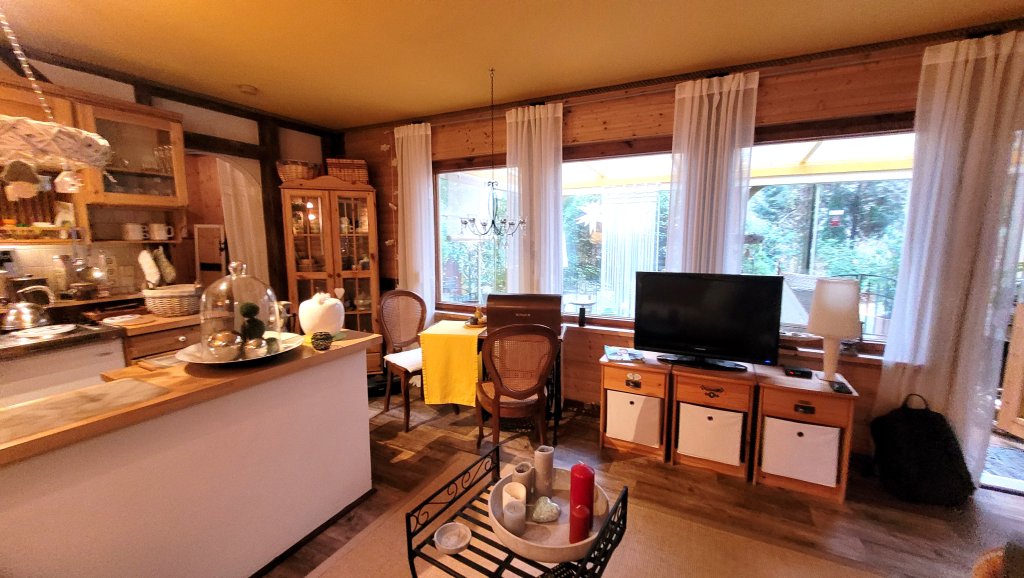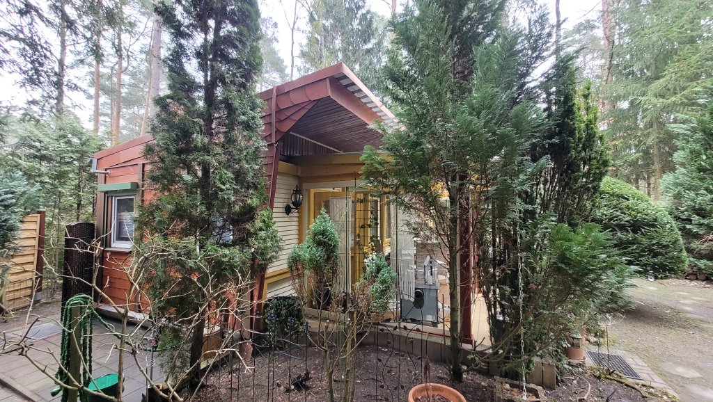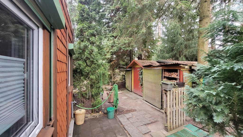 Das 419 m² große Grundstück ist Teil einer Wochenendsiedlung und mit einem ca. 37 m² großen Wochenendhaus bebaut. Das Wochenendhaus umfasst einen Wohnraum mit Küchenbereich, ein Schlafzimmer und das Bad mit WC und Dusche. Es wird möbliert übergeben. Hinzu kommen zwei kleine Schuppen sowie ein überdachter Bereich für Feuerholz und ein Carport. Das Wochenendhaus wurde in den letzten Jahren gründlich saniert: Unter anderem wurde ein Kaminofen eingebaut, das Bad sowie der Schlafraum einschließlich der Fenster erneuert, die Fassade neu verkleidet und die Terrasse in einen gemütlichen, nach Süden ausgerichteten Wintergarten umgewandelt. Das Häuschen wurde bisher in der warmen Jahreszeit genutzt, wobei der Kaminofen auch im Frühling und Herbst für behagliche Wärme sorgt.
