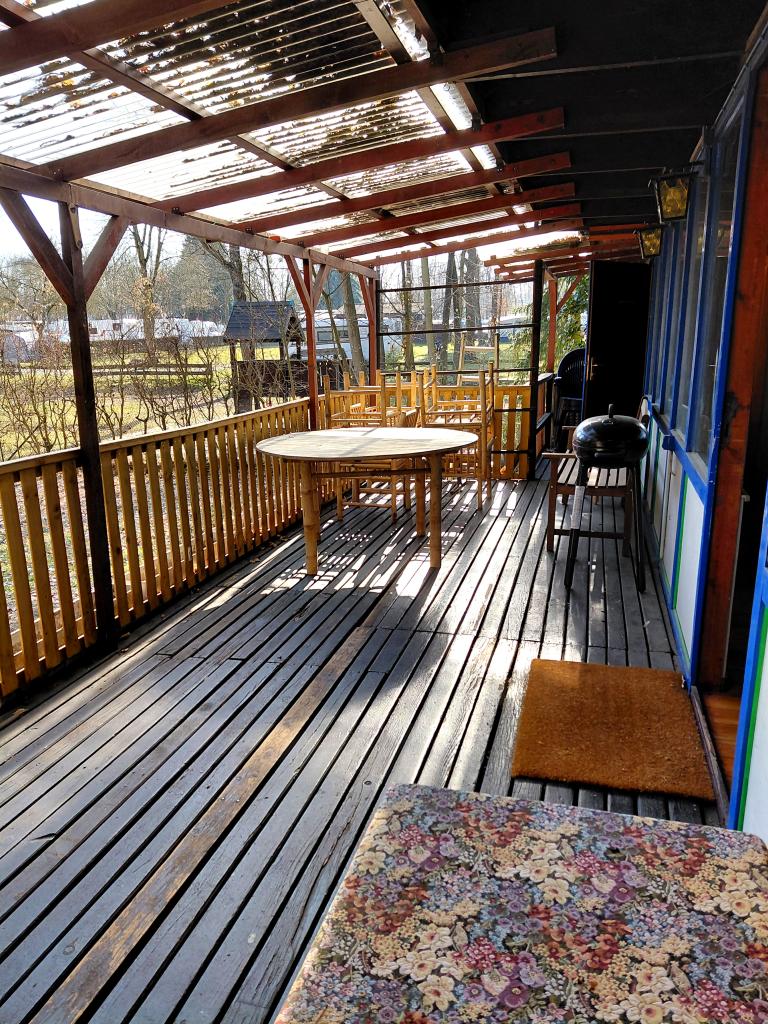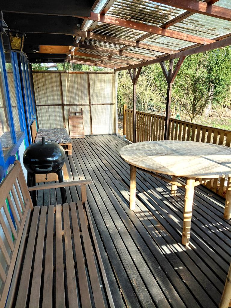 Innerhalb der letzten drei Jahre wurde das Häuschen renoviert, der Holzboden abgeschliffen und geölt, die Terrasse mit Holzboden, Überdachung und Geländer neu aufgebaut sowie Sandkasten und Schaukel installiert. Das Wochenendhaus wird mit allem Mobiliar, Inventar und Lagermaterial verkauft. Ebenfalls mitverkauft wird der Bausatz für einen kleinen Holzschuppen. Trinkwasser und Strom liegen an, das Abwasser wird in einer Grube aufgefangen.